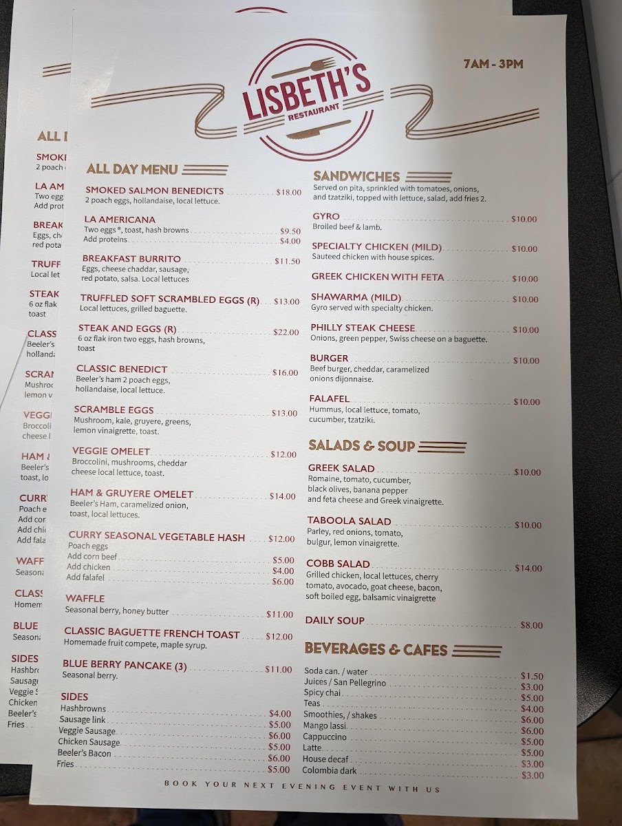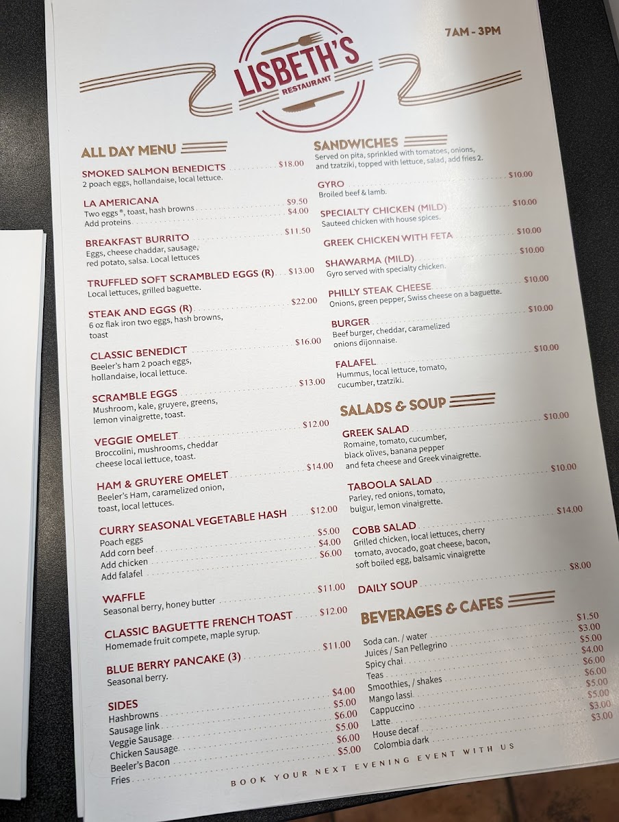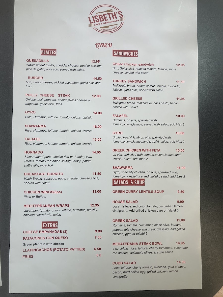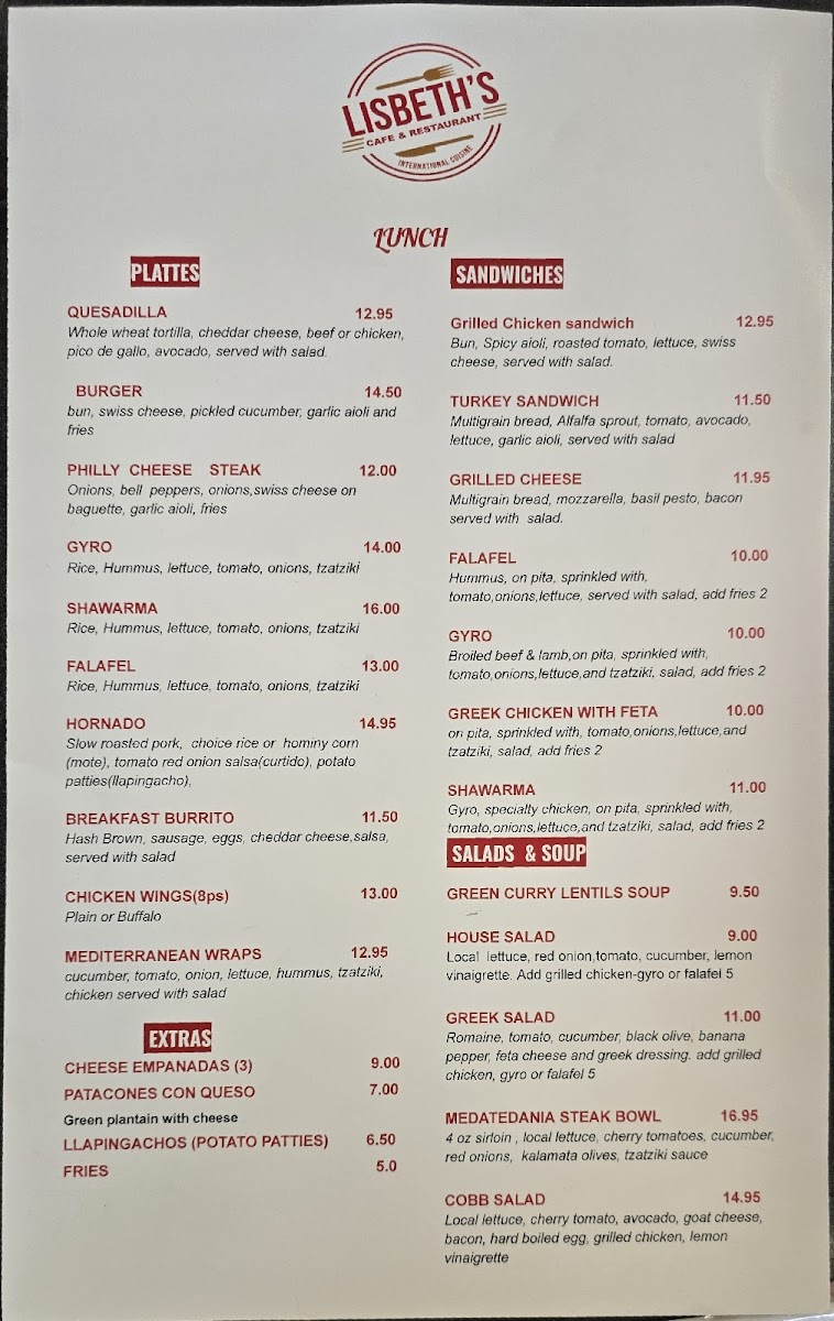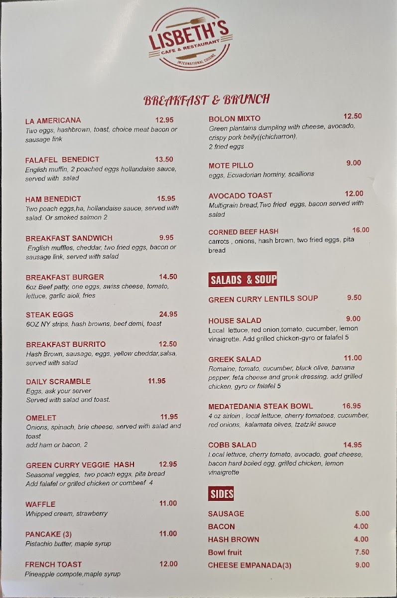 Welcome to LISBETH CAFE RESTAURANT, a true culinary gem nestled in New Brighton, MN. This inviting eatery offers a diverse menu that ensures there's something for everyone, whether you're craving a leisurely brunch or a quick lunch. Start your day with the exquisite Smoked Salmon Benedict, featuring poached eggs and hollandaise sauce on a toasted English muffin, paired with refreshing mixed greens. For a hearty lunch, savor the savory Gyro or the flavorful Shawarma served in warm pita, complemented by fresh toppings and tzatziki. Be sure to wash it down with their refreshing smoothies or rich cappuccinos, the perfect accompaniment to your meal. Customers rave about the deliciousness and presentation of every dish, making LISBETH a must-try. The delightful ambiance, combined with attentive service, further enhances the experience. Dive into the flavors at LISBETH and let your taste buds embark on a delightful journey!